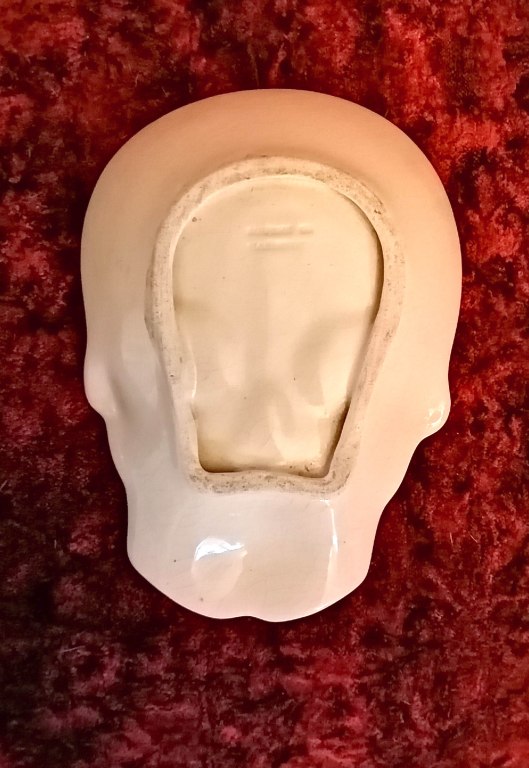 I was looking at him yesterday and recalled never being able to read the stamp on his backside, so thought I’d see if I can put a maker’s name to his bony face. I’ve photographed the stamp as best I can a couple of ways and by eye too, think it says ‘Bourne or Courne of (&) Har……’ I can’t work out the rest and may be wrong about the former. He’s old, but how old I don’t know. There’s a fair amount of cracking to his glaze mind, so I’m thinking pre-1960’s.